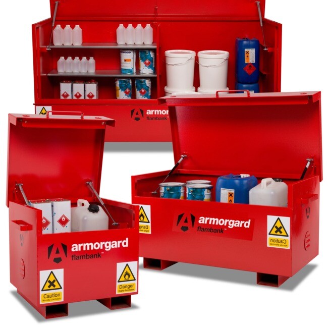 Purpose-built for the safe storage flammable substances, the Armorgard ChemBank™ FB1, with dimansions 100x54x49cm, conforms to all relevant HSE requirements. -