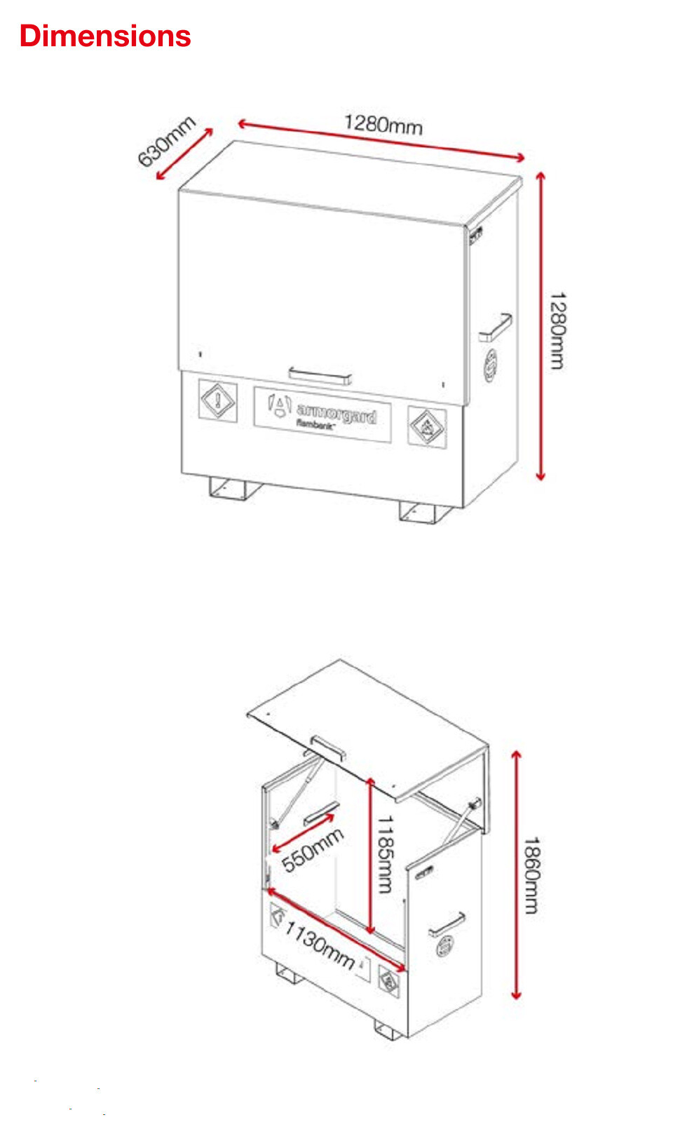 Purpose-built for the safe storage flammable substances, the Armorgard ChemBank™ FBC4, with dimansions 128x63x128cm, conforms to all relevant HSE requirements. The tough welded construction delivers maximum protection from thieves and the elements, while its distinctive bright red colour and signage make it easy to distinguish between fuel and chemical stores – a particular benefit for sites with multi-national workforces..