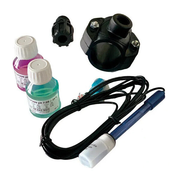 pH Installation Kit for swimming pools, drinking water and greenhouses. Contains a pH sensor with all components for mounting on the pipe and connection to the controller.