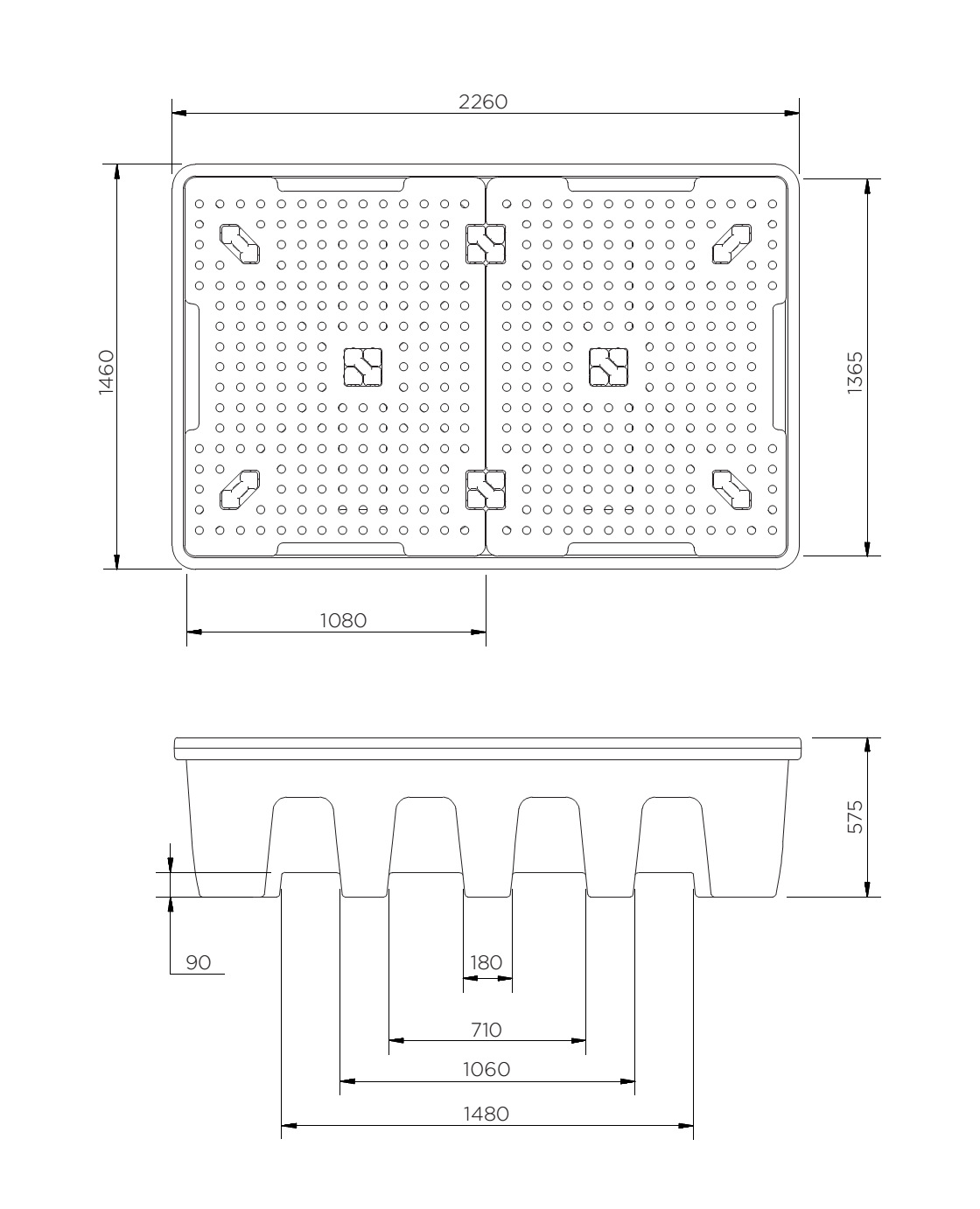 Διπλή Λεκάνη Συλλογής Διαρροών για IBCs κατάλληλα σχεδιασμένη για να συλλέγει διαρροές και σταγονίδια από 2 IBC παλετοδεξαμενές αποθήκευσης λαδιών και χημικών και να εμποδίζει την εξάπλωση των ρύπων στο δάπεδο και σε συστήματα αποχέτευσης.