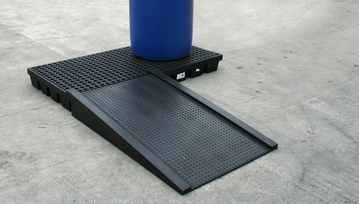Ράμπα για Δάπεδα Συλλογής Διαρροών εύκολη μεταφορά των δοχείων και των βαρελιών στον αποθηκευτικό χώρο. Βοηθάει στην σύνθεση και δημιουργία χώρων αποθήκευσης και φύλαξης δοχείων και βαρελιών που περιέχουν υδρογονάνθρακες, λάδια, χημικά κ.α.